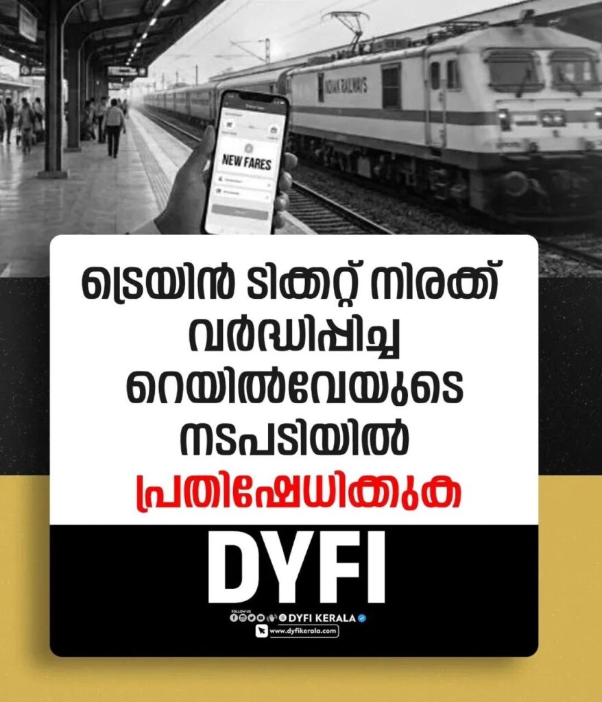 ട്രെയിൻ ടിക്കറ്റ് നിരക്ക് വീണ്ടും വർദ്ധിപ്പിച്ച കേന്ദ്രസർക്കാർ നടപടി അപലപനീയവും പ്രതിഷേധാർഹവുമാണ്.തുടർച്ചയായി രണ്ടാം തവണയാണ് ഈ വർഷം ടിക്കറ്റ് നിരക്ക് റെയിൽവേ വർദ്ധിപ്പിക്കുന്നത്.ഇത് സാധാരണക്കാരായ യാത്രക്കാരോടുള്ള വെല്ലുവിളിയാണ്.ഡിസംബർ 26 മുതൽ കൂടിയ ടിക്കറ്റ് നിരക്ക് പ്രാബല്യത്തിൽ വരും. 215 കിലോമീറ്ററിന് മുകളിലുള്ള ഓർഡിനറി ക്ലാസ് ടിക്കറ്റുകളുടെ നിരക്ക് കൂട്ടിയിട്ടുണ്ട്.